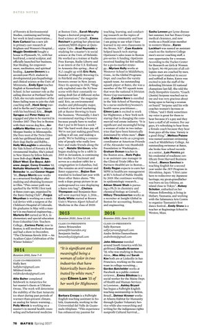 teaching, learning, and conducting research on the topics of classroom community and how I am going to use what I have learned in my own classrooms in the Bronx, N.Y.”…Cam Kaubris helped launch tech startup OpsGenie’s sales team in Boston pre-series A funding. OpsGenie received funding for $10 million for a go-to-market strategy....Myriam Kelly works at Westover School in Middlebury, Conn., in the Global Programs Dept. and coaches the varsity squash team. An outstanding squash player at Bates, she was a member of the NY squash team that won the national A Division Howe Cup tournament last year....Caroline Kern is enrolled in the Yale School of Nursing to be a nurse-midwifery/women’s health nurse practitioner.... Eileen Lam is excited to work for Hightower, a New York tech startup that is changing the commercial real estate industry. “It is significant and meaningful being a woman of color in two industries that have been historically dominated by white men.”…Danielle Muñoz works as a program coordinator at American Friends of the Alexander von Humboldt Foundation in Washington.... Graham Oxman teaches in the Boston area....Nate Pajka is an assistant case manager in the Clinical Trials Office for Partners HealthCare in Boston.... Emily Regan expects to earn her MPH in healthcare management at BU’s School of Public Health by 2019. She continues working in epidemiologic research.... Adnan Shami Shah is pursuing a Ph.D. in chemistry and chemical biology at Cornell.... Hillary Throckmorton works as a recruiter at Insight Global in Boston for accounting, finance, and engineering.