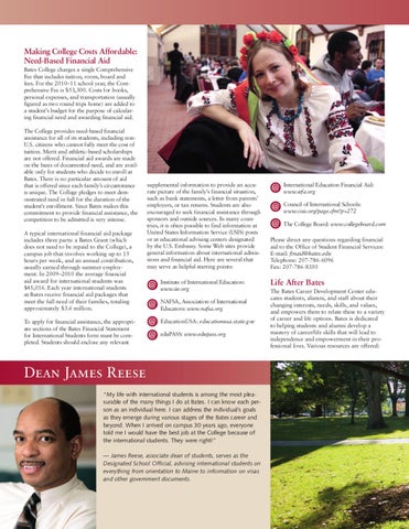 Dean James Reese “My life with international students is among the most pleasurable of the many things I do at Bates. I can know each person as an individual here. I can address the individual’s goals as they emerge during various stages of the Bates career and beyond. When I arrived on campus 30 years ago, everyone told me I would have the best job at the College because of the international students. They were right!” — James Reese, associate dean of students, serves as the Designated School Official, advising international students on everything from orientation to Maine to information on visas and other government documents.