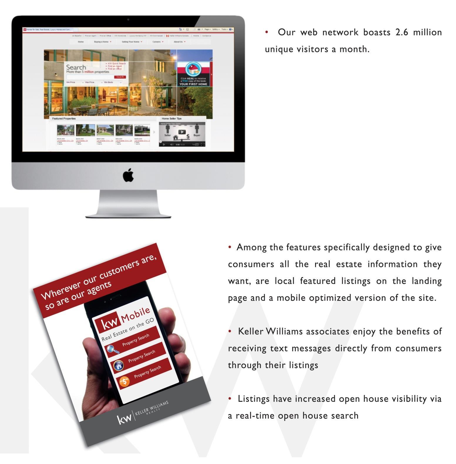 • Leading-edge tech tools and training give us the edge in effectively marketing your property online, 24 hours a day, seven days a week! Through KW’s exclusive Keller Williams Listing System (KWLS), your property is fed to more than 350 online search engines and available on KW’s Web network of more than 76,000 sites.