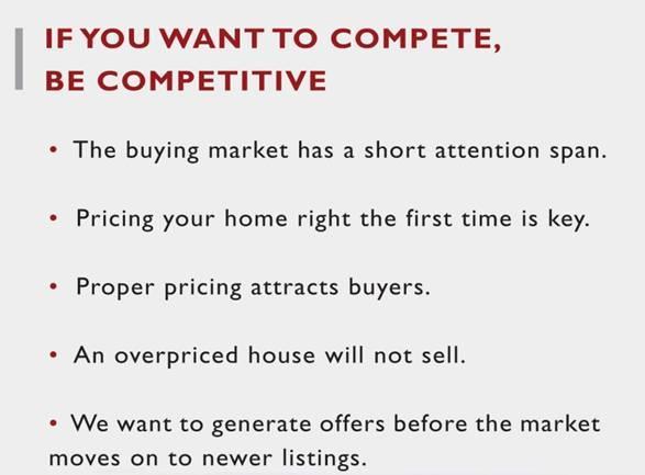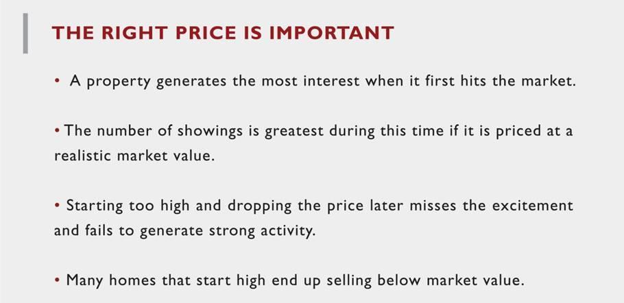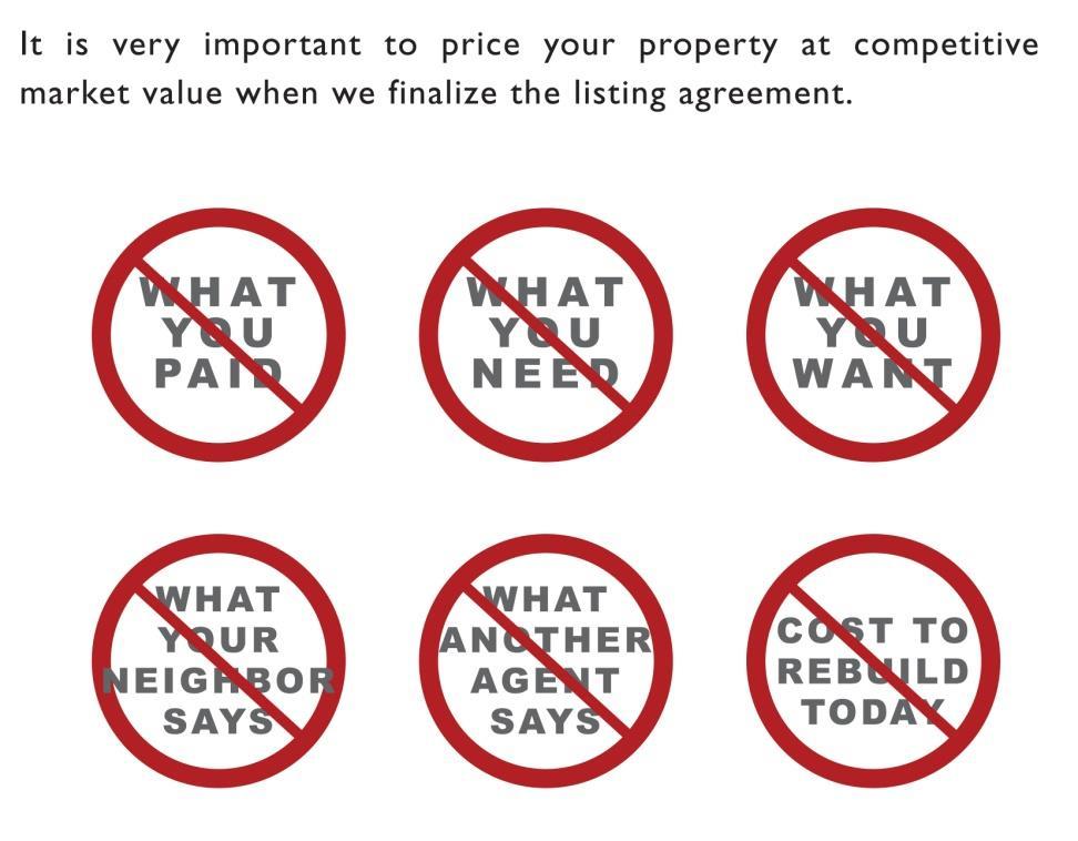 • Pricing your property too high may make it necessary to drop the price below market value to compete with new, well priced listings.