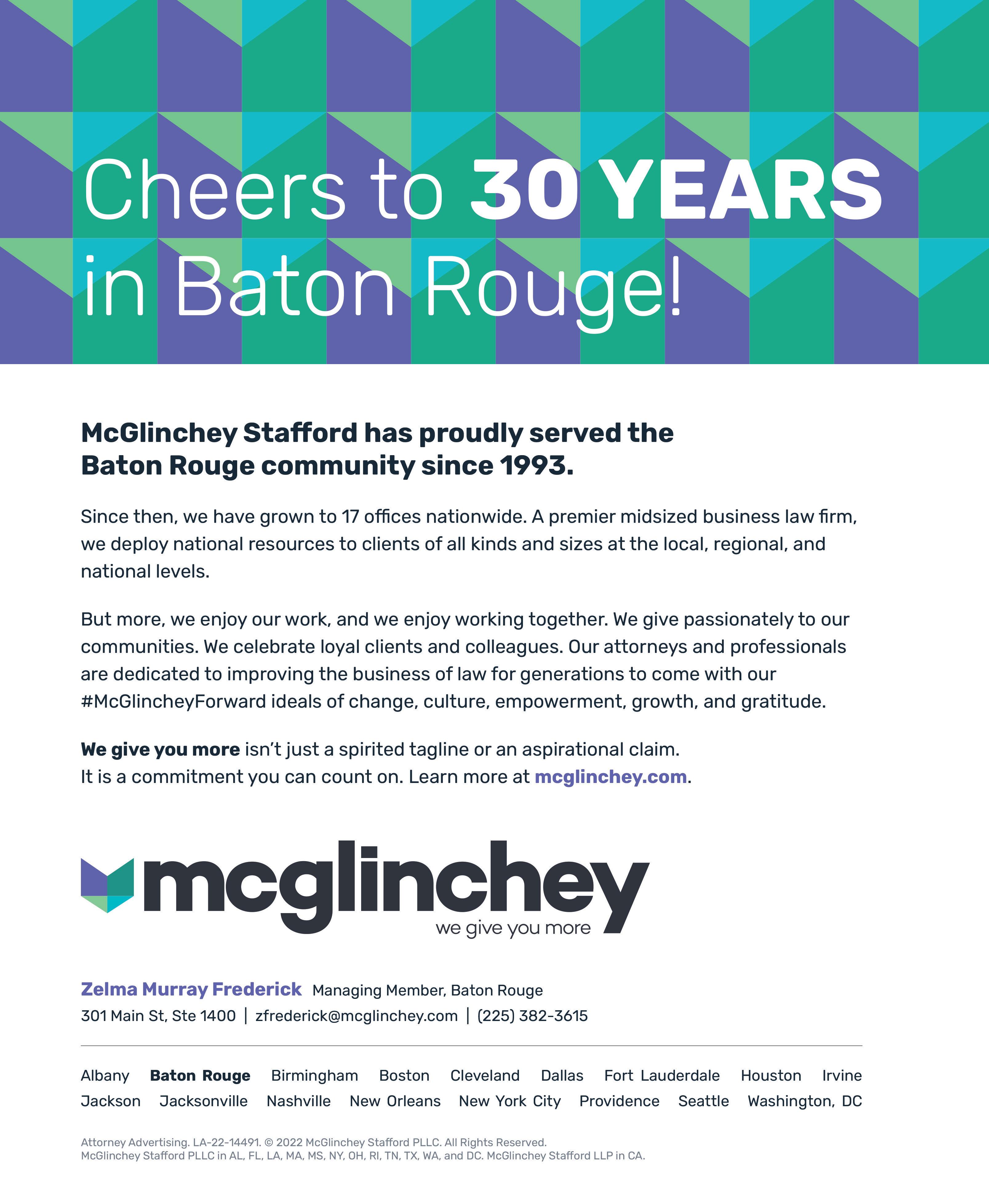 The Greater Baton Rouge Business Report cannot be responsible for the return of unsolicited material— manuscripts or photographs, with or without the inclusion of a stamped, self-addressed return envelope. Information in this publication is gathered from sources considered to be reliable, but the accuracy and completeness of the information cannot be guaranteed. No information expressed here constitutes a solicitation for the purchase or sale of any securities.