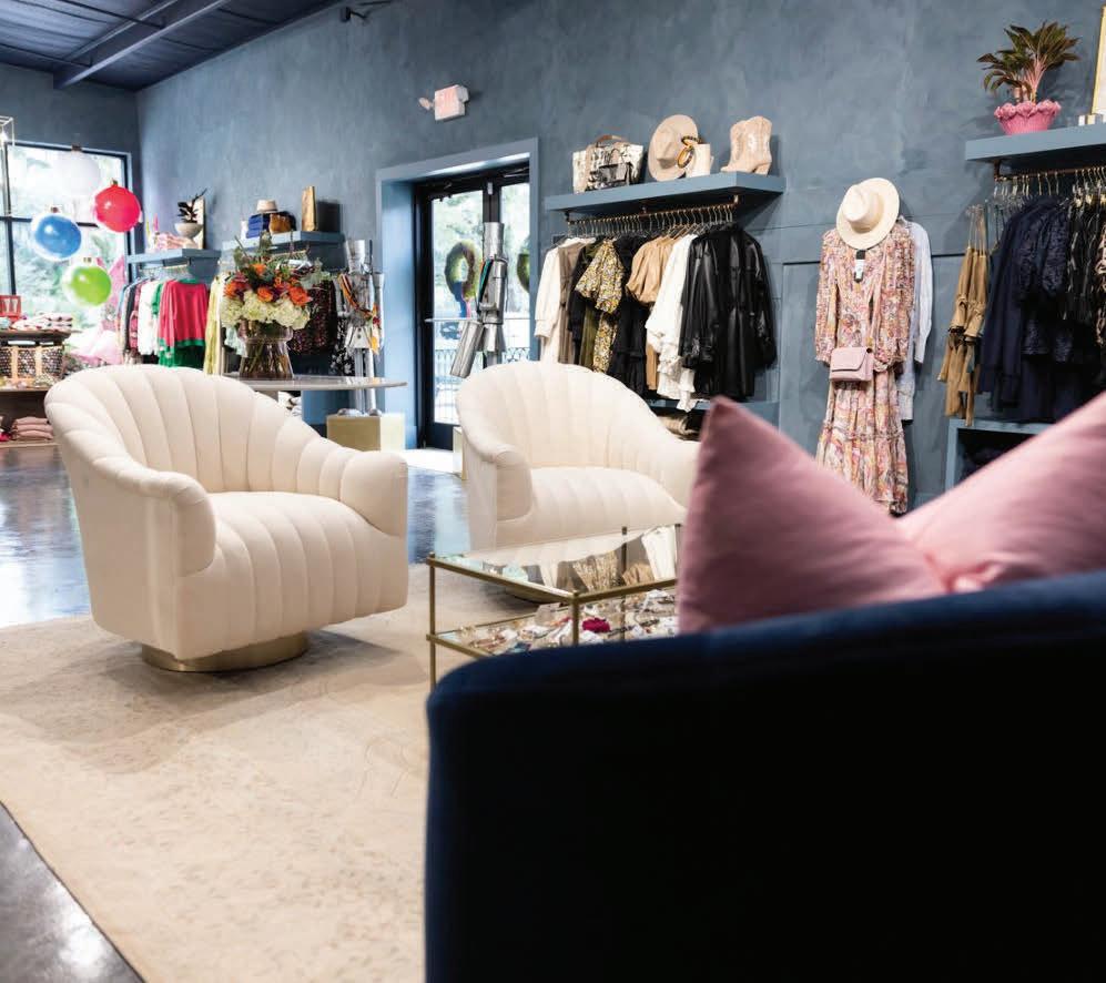 The Green Space (left) is the hub of all businesses located in North Commerce, surrounded by shops, restaurants and luxury accommodations, including fine furniture at The Corbel (top); Big River Pizza Company (center left); the women’s clothing boutique Barlow (center right); and the Hotel Toussaint (bottom).