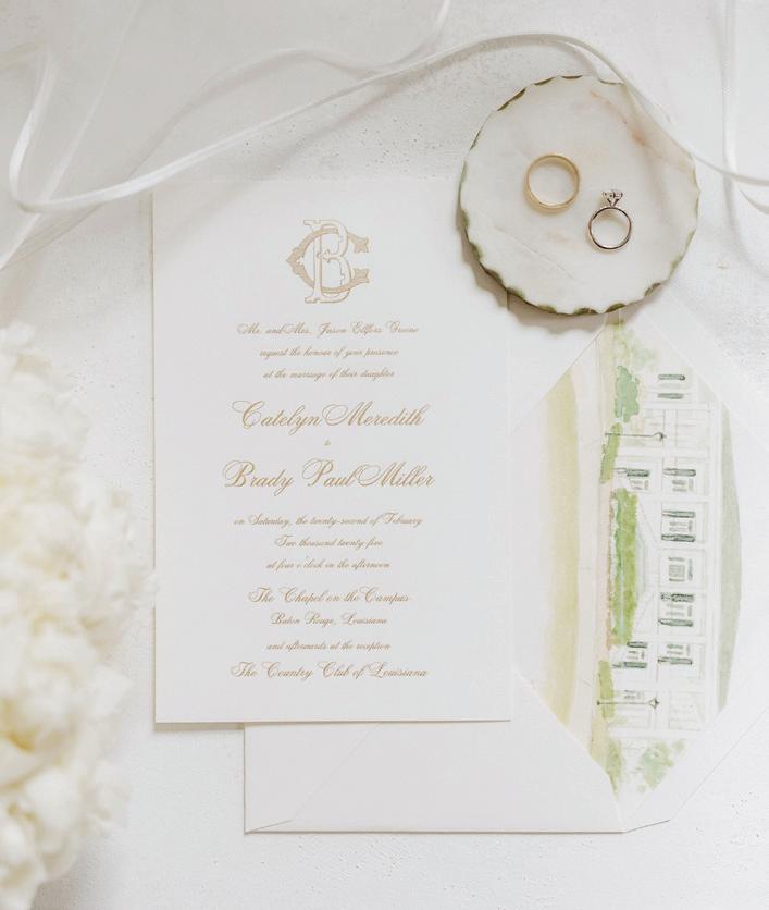 Weddings are going to the dogs— literally. Couples are finding ways to incorporate their four-legged friends into their big day, from signature cocktails to wedding cake details. But, increasingly, pets are also making the guest list. Wren Bell and Austin Clinkscales posed for wedding day portraits with their beloved golden retriever, Beignet. And, later in the night, guests were treated to the pup’s namesake treats along with espresso martinis at a reception bar branded just for Beignet himself. For ideas to add furry friends and tail-wagging fun to your wedding celebration, visit inRegister.com/ weddings/doggone-details