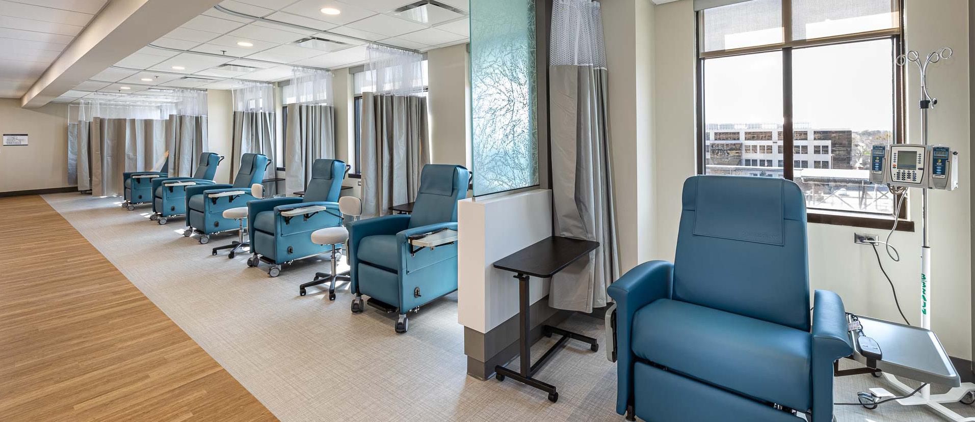 The facility also offers approximately 20,000 SF of expansion space, ensuring capacity for future growth. A striking two-story atrium welcomes visitors with a shared waiting area for the physician practices and an enclosed interior fountain wall. On the second floor, infusion bays are thoughtfully positioned along the perimeter, offering serene views of a landscaped public green space, enhancing the healing environment.