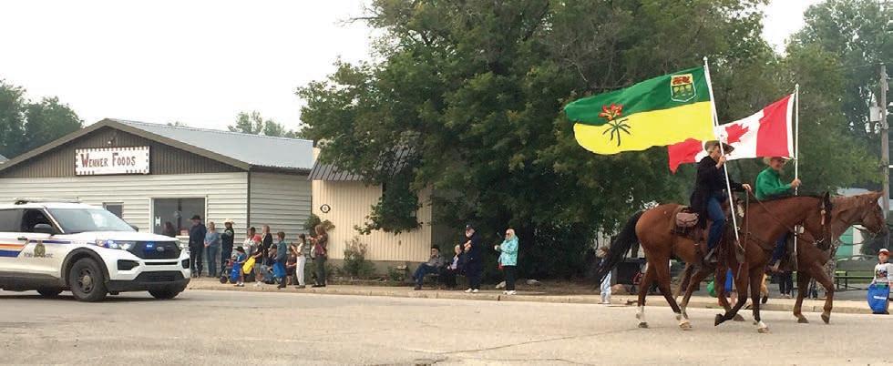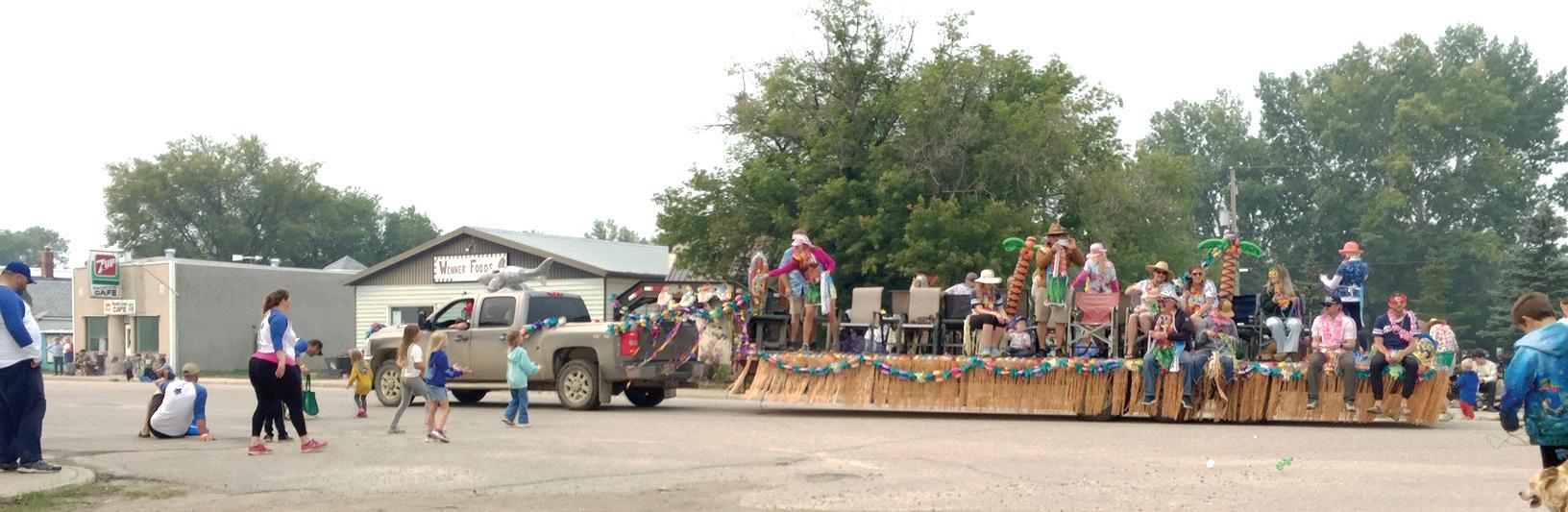 The parade was led by Dale and Diane Keiper on horseback carrying the Canadian and Saskatchewan flags, followed by RCMP, TNT Centre wagon pulled by team of heavy horses, vintage cars, a truck advertising solar energy, Nutting family float dressed in beach wear throwing out Mardi Gras necklaces, Chev monster truck, International truck, vintage tractors – Farmall H,