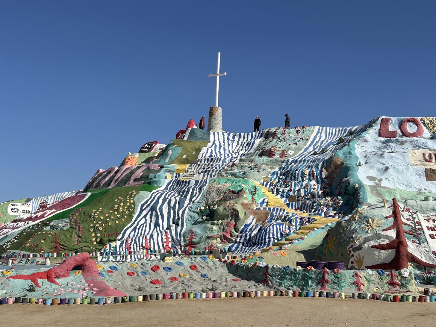 of gallons of colourful paint. Leonard Knight saw his vision come true with the help of many. This is a monument to God’s love, as he became a spiritual person in his middle age. It took approximately 30 years to create. The installation includes biblical verses and a large red heart and at the peak of this fake mountain is a tall white cross. It is considered