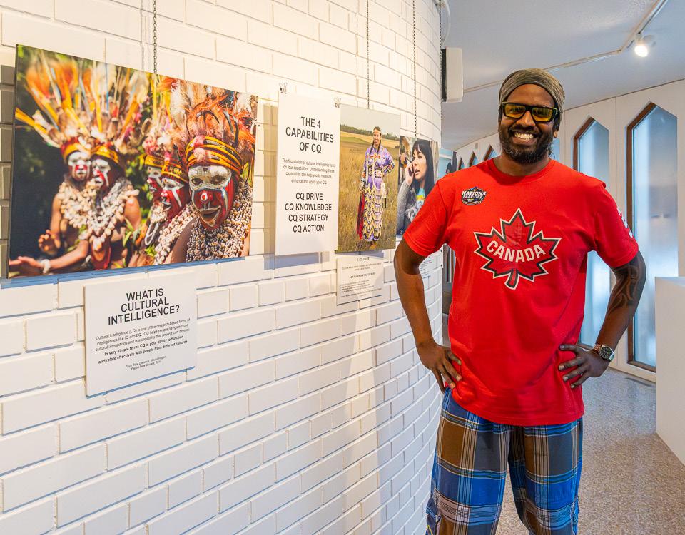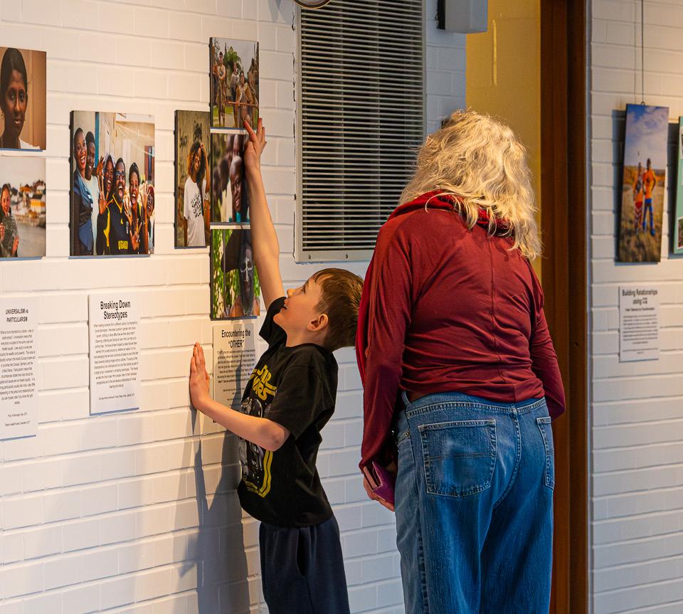 A little boy points to a photo taken by Wilbur Sargunaraj on display to his mother. |