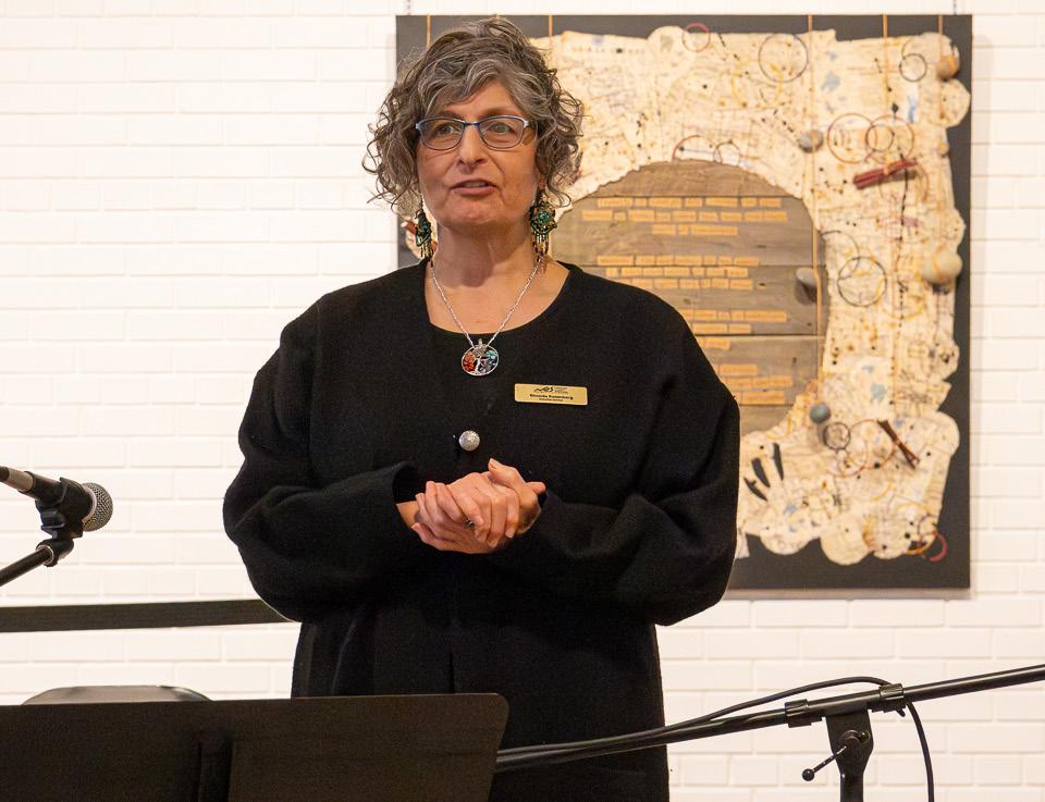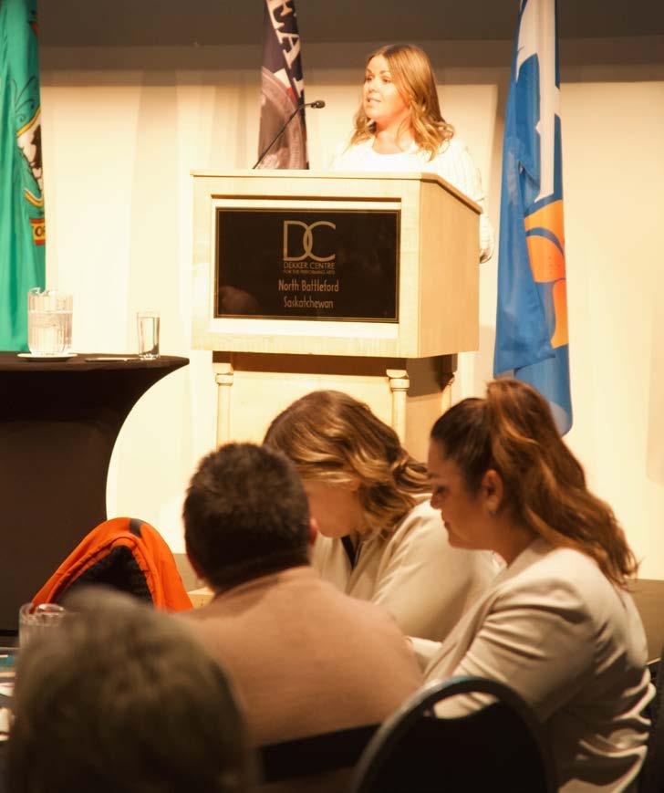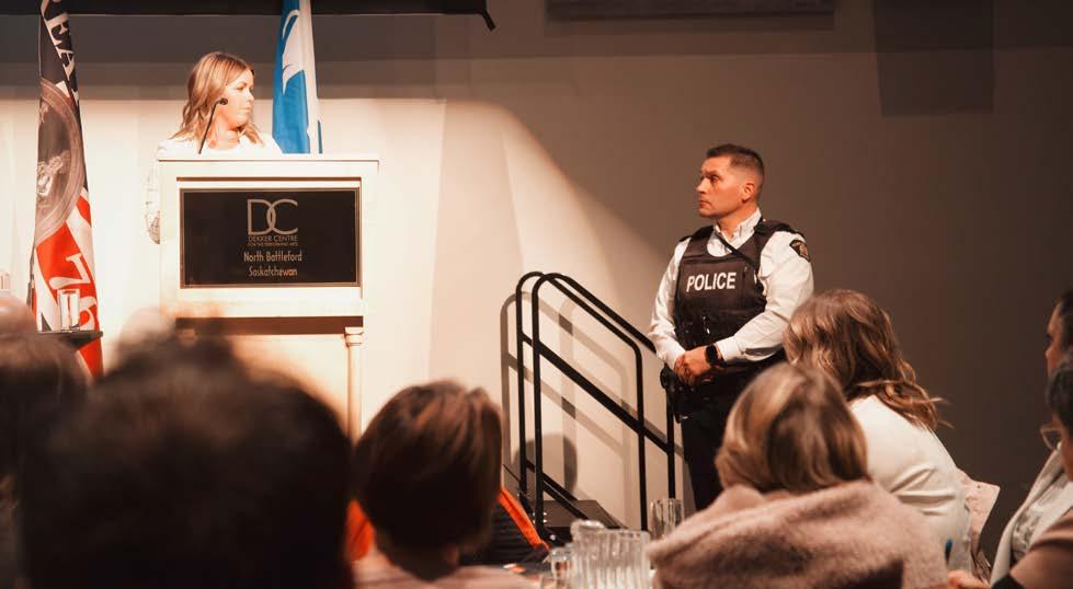 Mayor Kelli Hawtin delivers the 2025 State of the City Address at the Dekker Centre in North Battleford. An RCMP officer stands by as she discusses key initiatives, including economic growth, population challenges, and public safety efforts. | Photo by Matthias