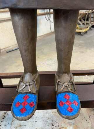 The life-sized bronze sculpture, titled “Annie Peyachew,” – A little girl standing on her own, with beaded moccasins and holding on to the smudge bowl where she would burn sweet grass to pray.
