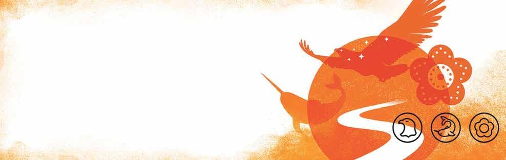 resent the collective effort that is essential to reconciliation. The ribbon-like skyline pays tribute to the province’s identity as ‘the land of the living skies’ and traditional ribbon skirts. The river’s — kisiskâciwan — eight circles symbolize the number of native berries of Saskatchewan. The two upright feathers evoke a sense of respect and honour, while representing two-spirited people, acknowledging their roles as guides and their diverse perspectives within the community. Feathers are a powerful symbol of the highest form of respect and the importance of inclusivity.