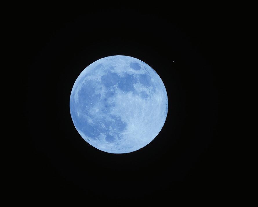 Before Christmas I took this photo of the full moon with the planet Mars off in the distance at the two o’clock position. Mars is about three times larger than our moon, but is many, many millions of miles farther away from the earth. I used a blue filter to capture the beauty of space in the night sky. | Photo and text by Jim McLane.