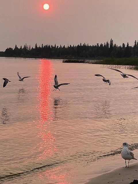 Hazy forest fire smoke drifting through Chitek Lake last week when Environment Canada informed people to stay indoors. The seagulls didn’t seem to mind.