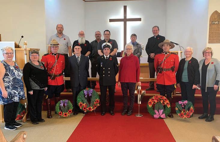 Participating in a Remembrance Day service in Radisson: front row - Lisa Rascher, Grace Schnsney, Sgt. C. Little, Murray Mikituk (retired reservist), Kim Baker (retired. navy), G. Maxwell (retired RCMP), Cst. O. Kwan, Miriam Loessin, Susan Rothernburger; back row - Dave Amson, Randy Hosegood, Bruce Flath, Nathan Halischuk, Logan Rookes and Pastor Bruce Ehlert. | Photo submitted