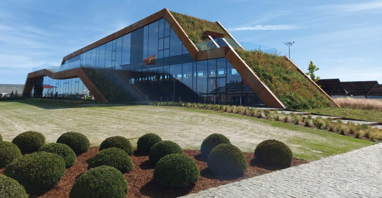 Das im Landwirtschaftssektor tätige Familienunternehmen Farming Agrícola beweist mit seinem modernen Firmensitz in Villamartín de Campos seine innovative Stärke in jeder Hinsicht. Auf dem 32 Hektar großen Gelände zieht das extravagante Bürogebäude mit rund 1.000 Quadratmeter blühender Dachlandschaft alle Blicke auf sich. Es wirkt, als erhebe sich der außergewöhnliche Gebäudekörper sachte aus dem Boden. Das liegt sowohl an den Dachflächen, die ganz bis zum Boden reichen, als auch an der luftig leichten Eleganz der Glasfassaden.