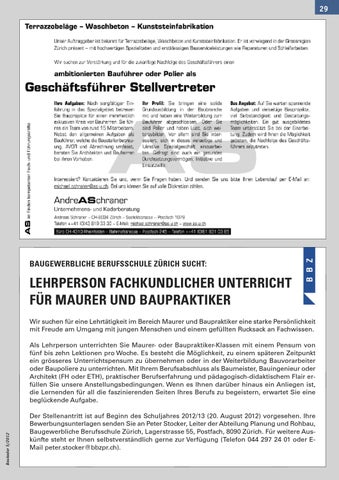Als Lehrperson unterrichten Sie Maurer- oder Baupraktiker-Klassen mit einem Pensum von fünf bis zehn Lektionen pro Woche. Es besteht die Möglichkeit, zu einem späteren Zeitpunkt ein grösseres Unterrichtspensum zu übernehmen oder in der Weiterbildung Bauvorarbeiter oder Baupoliere zu unterrichten. Mit Ihrem Berufsabschluss als Baumeister, Bauingenieur oder Architekt (FH oder ETH), praktischer Berufserfahrung und pädagogisch-didaktischem Flair erfüllen Sie unsere Anstellungsbedingungen. Wenn es Ihnen darüber hinaus ein Anliegen ist, die Lernenden für all die faszinierenden Seiten Ihres Berufs zu begeistern, erwartet Sie eine beglückende Aufgabe. Der Stellenantritt ist auf Beginn des Schuljahres 2012/13 (20. August 2012) vorgesehen. Ihre Bewerbungsunterlagen senden Sie an Peter Stocker, Leiter der Abteilung Planung und Rohbau, Baugewerbliche Berufsschule Zürich, Lagerstrasse 55, Postfach, 8090 Zürich. Für weitere Auskünfte steht er Ihnen selbstverständlich gerne zur Verfügung (Telefon 044 297 24 01 oder EMail peter.stocker@bbzpr.ch).