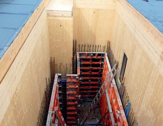 Prima si monta la costruzione in legno, poi si getta il calcestruzzo liquido: questa è la nuova sequenza con cui gli ingegneri delle costruzioni in legno hanno fatto buone esperienze. L'inversione delle fasi di lavoro è la logica conseguenza degli attuali metodi di lavoro, perché i costruttori in legno calcolano con tolleranze minori rispetto ai costruttori in calcestruzzo. Gli elementi in legno sono prefabbricati al millimetro. Questa precisione non è possibile quando si realizza il c alcestruzzo in cantiere. Per questo Timbatec prevede che il calcestruzzo del vano ascensore sia l'ultimo pezzo del puzzle.
