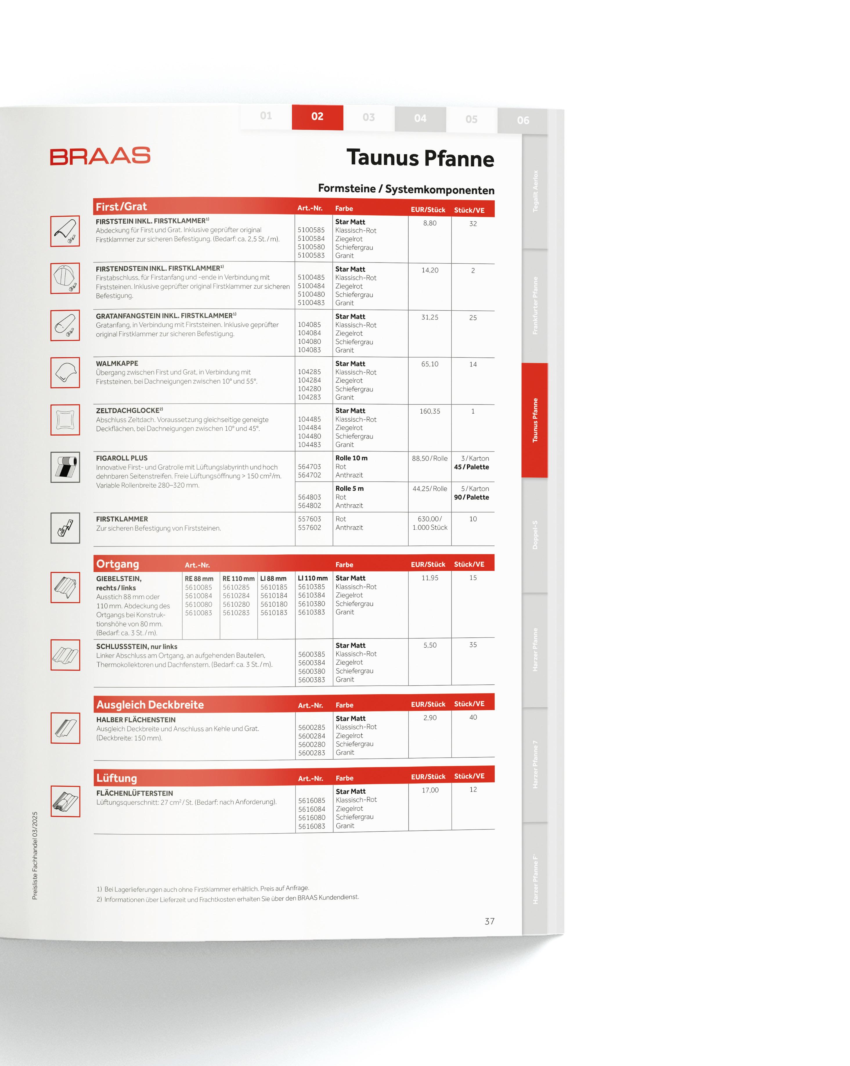 Die Reihenfolge der aufgeführten Produkte ist immer gleich: vom Flächenstein bzw. Flächenziegel über First / Grat bis hin zur Befestigung.
