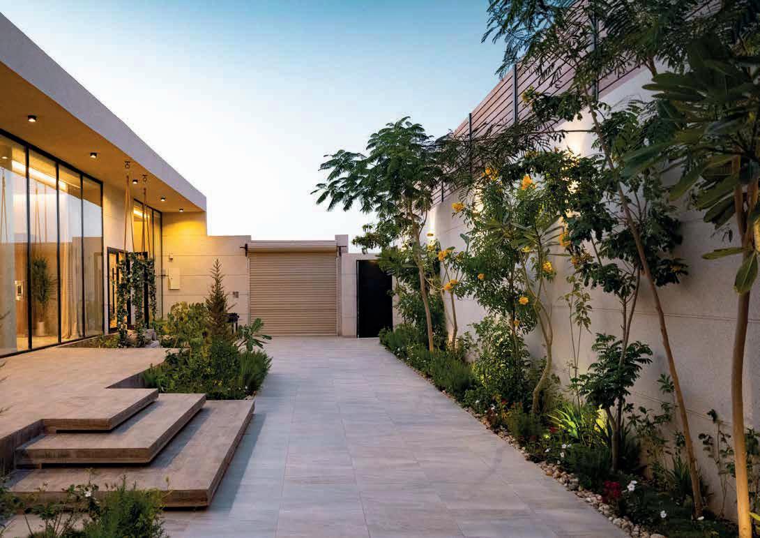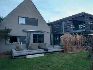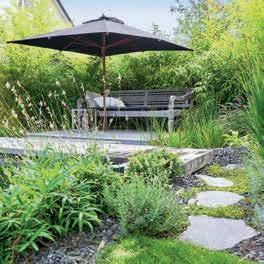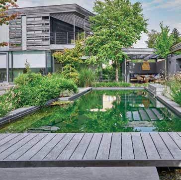Dazu gehört auch der bewusste Verzicht auf aufwendige Formschnittgehölze, die Integration einer automatischen Bewässerung sowie die Begrünung der Dachterrasse sowie der Dächer von Carport und Gartensauna. Außerdem zeichnen den Garten die flächendeckende Bepflanzung für eine insektenfreundliche Blüte von Frühjahr bis Herbst, Solitärgehölze als Sichtschutz und die Verwendung von Naturstein und großformatigen Platten aus.
