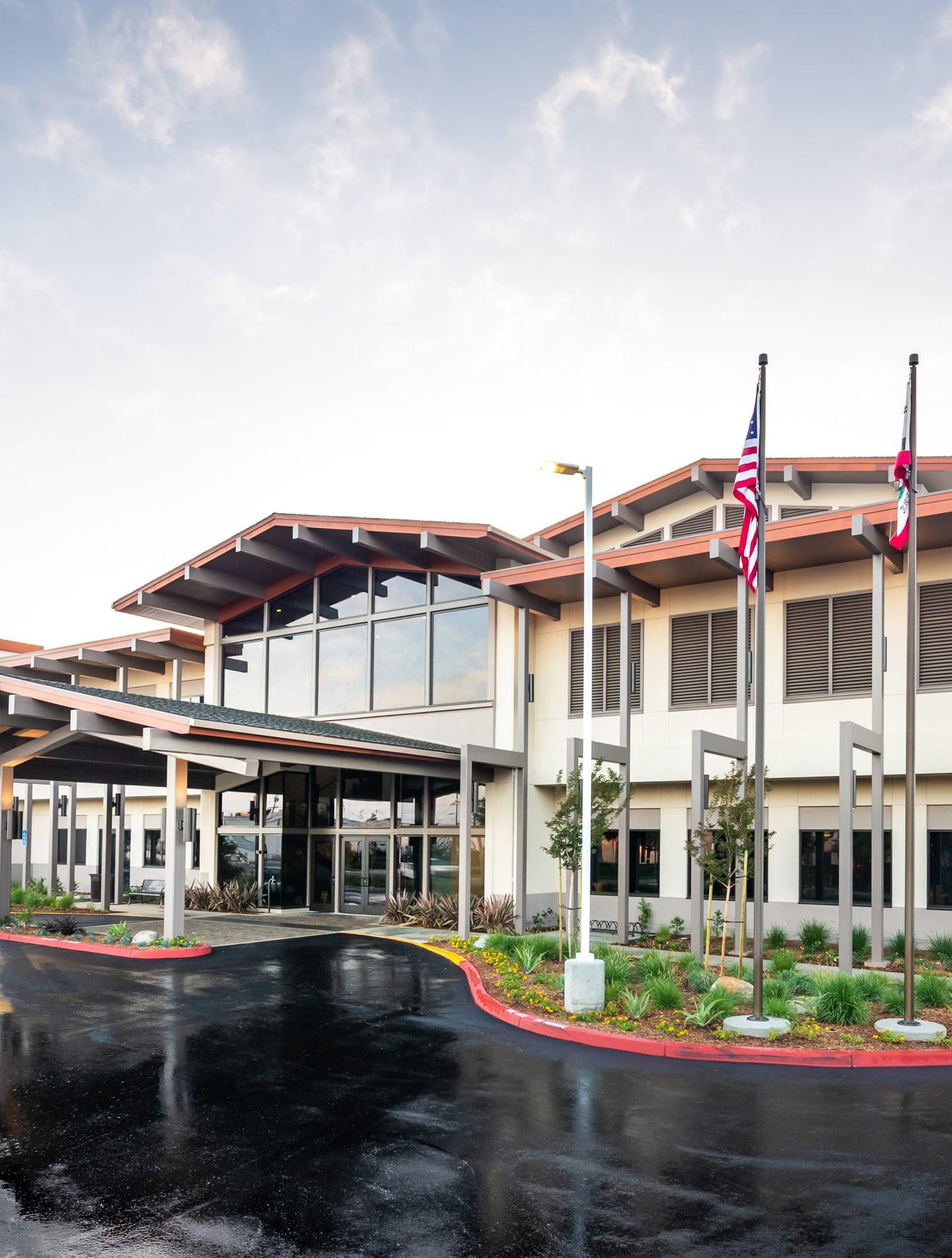 This assisted living and memory care facility wraps around two interior plazas that showcase string lighting, shade structures, decorative pottery, and enhanced concrete paving and Mediterranean planting.