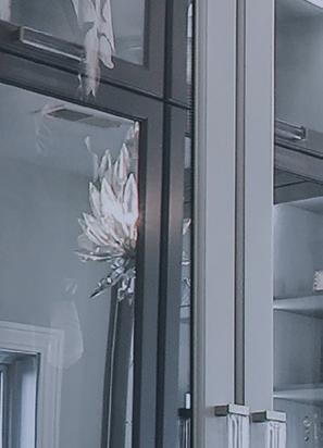 Heckman’s theory was put to test in “the blue room” (which is a queen guest room) with very contemporary design and hardware that brought the room alive. He infused different textures into the room— there was no traditional nightstand next to the bed—but rather glass top nightstand with a blue-and-white swirled top (that resembles marble, but it is glass) and a metal base.
