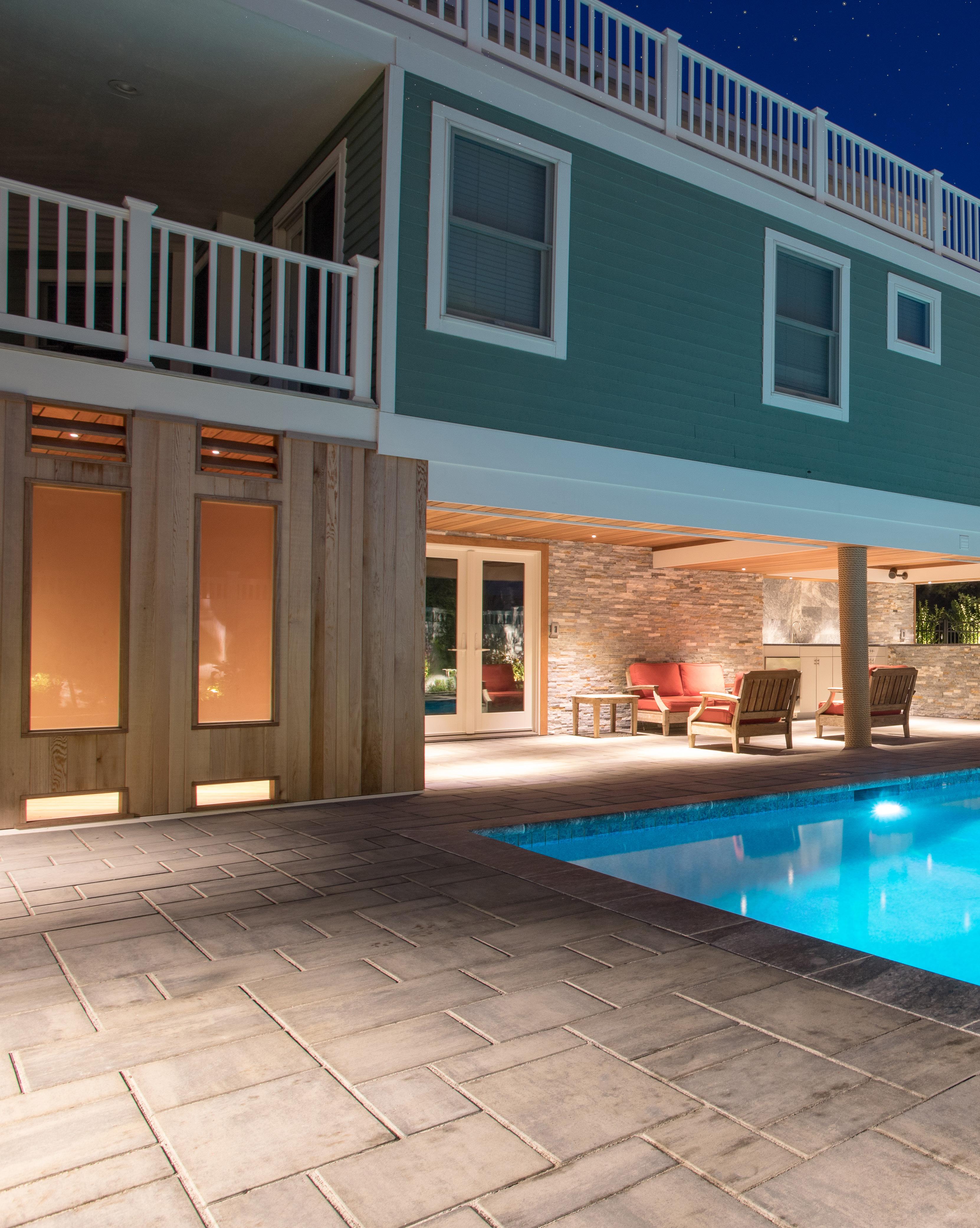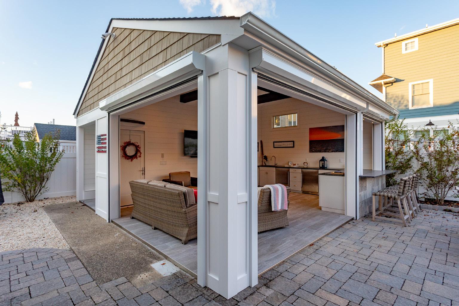 The importance of a ground level or detached garage to homeowners on LBI cannot be overstated. Besides sheltering vehicles, they provide necessary storage space for every summertime essential at the beach--from surf boards to outdoor furniture from HVAC equipment to outdoor appliances. Often overlooked in this drab, though indispensable environment, is the untapped potential for development. By thinking ‘inside’ the box, these cavernous spaces can be transformed into multi-functional and highly aesthetic entertainment rooms that bridge the gap between interior and exterior, day and nighttime living.