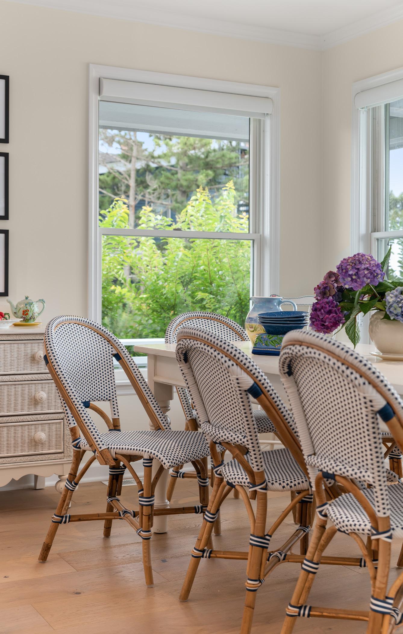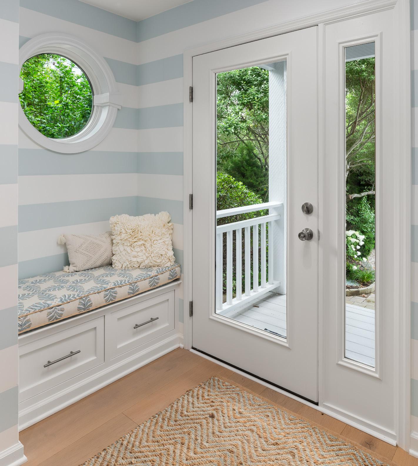 sense of coziness. Tuft pillows in the bunk rooms, starfish pillow accents very sophisticated chairs in all the bedrooms all added to the elevated vibe of the décor. The Blue room was adorned with a gray stripe and dark blue leather piping chair upholstery, and the guest room was adorned with a horizontal striped sitting chair instead of the traditionally vertical stripes. The second primary bedroom evoked a silver rocker with a plethora of blue accents, and paired with a very contemporary white martini table beside it.