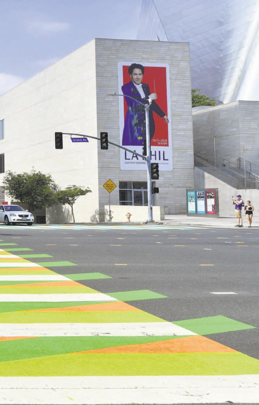 A painted sidewalk by Venezuelan-born artist Carlos Cruz-Diez leads to the Broad Museum in Los Angeles.