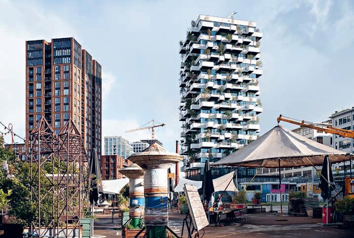 design the buildings considering the space that every tree, every plant, every bush should have in order to grow. It is a sequence of steps that produce very different results in terms of architecture. We have tried to make this typology more efficient. And more affordable, which was the main challenge, reducing the cost of construction. Thanks to prefabrication, the vertical forest is now fit even for social housing. Compared to the Milan prototype, we have reduced the construction costs by half. Another aim was to make these buildings more sustainable considering the consumption of energy. So, we are trying to enlarge the surfaces with photovoltaic panels and work with geothermal energy as often as possible. The organic facade actually reduces the heat on the façade in summer by some 30 to 45 degrees. The microclimate created by the trees and the plants is quite important. We also introduce wood in the construction process and use the prefabrication of wooden panels to reduce CO 2 emissions and speed up the construction process. We also spend a lot of time reusing water and using rainwater. Water management is becoming crucial.