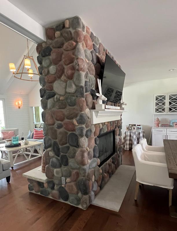What might be the most eyecatching feature of the living area is the fireplace, created from locallysourced stone. “It’s one of the most magnificent features ever,” Mary shares. “The detail is amazing. The rocks are hand-selected. They sorted through a pile of rocks to get those specific stones.” A second fireplace in the game room, though a touch smaller than the one in the living room, shares the same characteristics and steals the show.