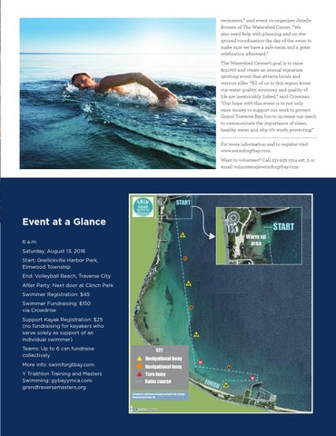Event at a Glance 8 a.m. Saturday, August 13, 2016 Start: Greilickville Harbor Park, Elmwood Township End: Volleyball Beach, Traverse City After Party: Next door at Clinch Park Swimmer Registration: $45 Swimmer Fundraising: $150 via Crowdrise Support Kayak Registration: $25 (no fundraising for kayakers who serve solely as support of an individual swimmer) Teams: Up to 6 can fundraise collectively More info: swimforgtbay.com. Y Triathlon Training and Masters Swimming: gybayymca.com grandtraversemasters,org