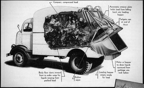 In 1938, Gar Wood Industries of Detroit introduced its first Load-Packer truck body that could be sized to multiple dimensions and mounted on many chassis It began to sell in quantity after World War II. Army engineers returning from Europe had been trained to dump all discards into a single hole and move on. The new compactor truck was perfectly suited to be married to the layered “sanitary” landfill developed in Fresno, California.