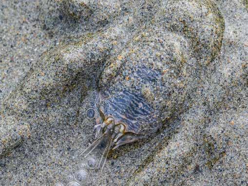 or a chance to admire great resilience , go wading on a (safe) sandy ocean beach. Where shallow waves slosh onshore, you may find the Pacific mole crab, aka sand crab, Emerita analoga—a creature at home in impermanence. Found in patches on Pacific beaches from Alaska to Baja California and Ecuador to Argentina, this small crustacean is often super-abundant from spring through fall. At area beaches, like Drakes in Marin, a scoop of wet sand may wriggle and twitch in your hands.