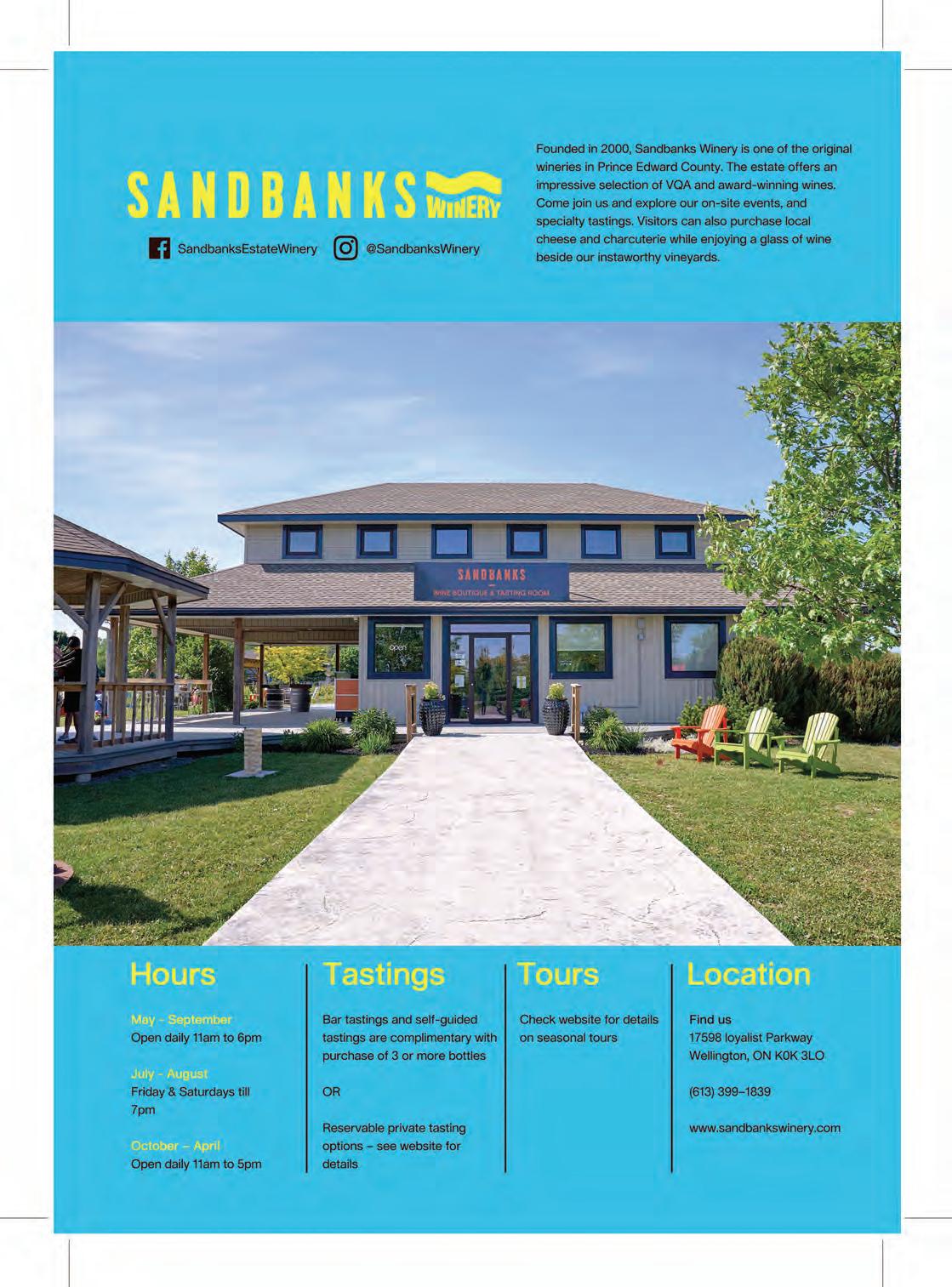 everyone! Well, southwest, as you take a down-to-earth wine tour along Loyalist Parkway. Kick things o at 33 Vines, where you’ll be tasting in the cellar like you own the place. Next up is Bergeron Estate Winery and Cider Company, o ering up estate-grown delights paired with Italian pies (Nonna-approved) on their vineyard-view patio. And last but not least, Longrid Estates boasts vineyards so scenic, you’ll feel like you’re in a painting. So grab a glass and get ready to sip, swirl, and spit (it’s allowed) your way through this emerging micro wine region.
