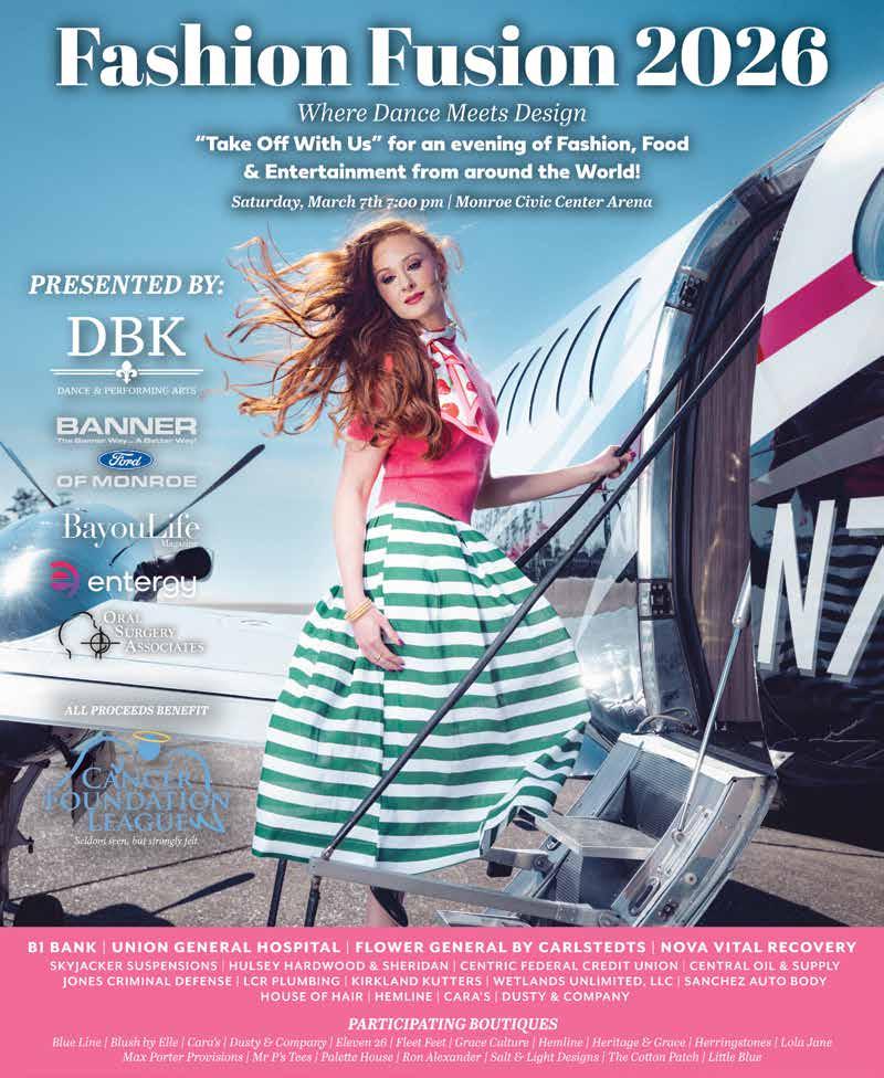 Fashion Fusion 2026 will mark 15 years of celebrating a community coming together for cancer patients right here in our area. All proceeds benefit the Cancer Foundation League of Northeast Louisiana which provides medical assistance and supplies to local patients and families affected by cancer. Join us on March 7, 2026 at the Monroe Civic Center for this fashionable event. On pages 116-123 find this beautiful fashion spread shot at the Monroe Regional Airport. Special thanks to our models, hair and makeup artist, Kelly Moore Clark and all the hands on deck who helped get the shoot off the ground.
