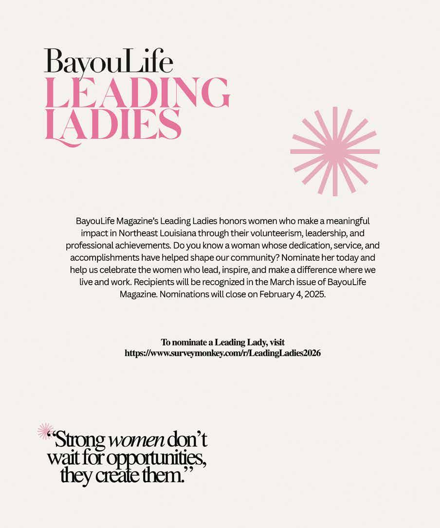 BayouLife Magazine is published and distributed by Redbird Publishing, LLC. Postal subscriptions ($30) can be ordered online at www.bayoulifemag.com. BayouLife Magazine is not responsible for unsolicited photographs, manuscripts, or other materials. Opinion columns do not represent the views of the publisher. Reproduction of contents without express written permission is prohibited.
