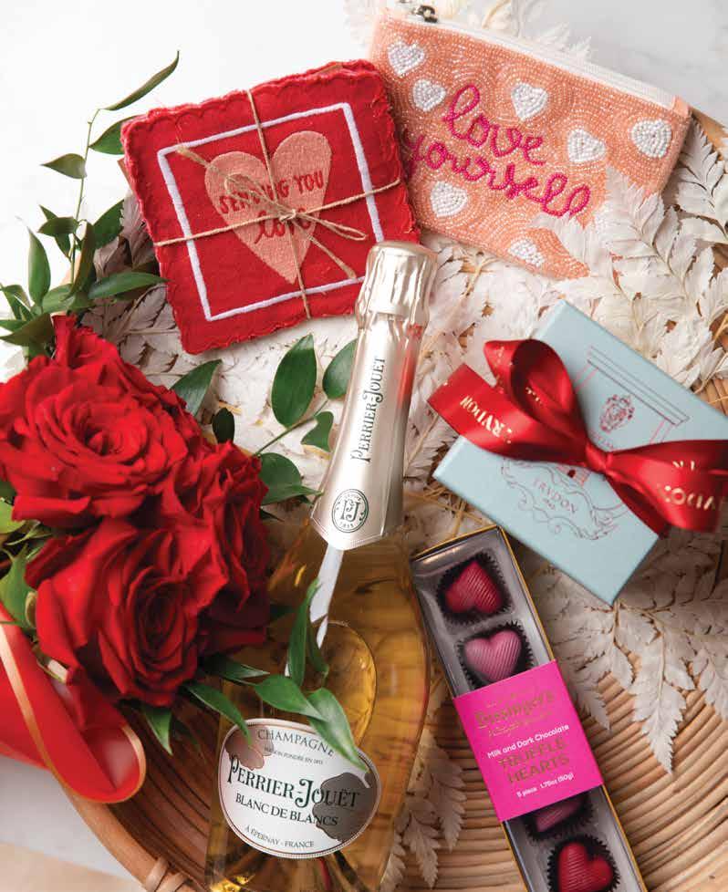 Look local for all things to warm your lover’s heart. A round, woven wood basket provides the base for all these goodies:
