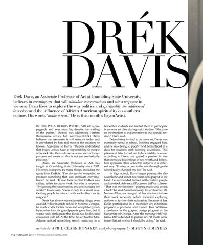 Drék Davis, an Associate Professor of Art at Grambling State University, believes in creating art that will stimulate conversations and stir a response in viewers. Davis likes to explore the way politics and spirituality are addressed in society and the influence of African American spirituality on southern culture. His works “make it real.” He is this month’s BayouArtist. IN 1926, W.E.B. DUBOIS WROTE, “All art is propaganda and ever must be, despite the wailing of the purists.” DuBois was addressing Harlem Renaissance artists, but Rodrecas (Drék) Davis believes the sentiment is still relevant today and is one shared by him and most of the creatives he knows. According to Davis, “DuBois understood that Negro artists have a responsibility to people who look like them—to serve some sort of larger purpose and create art that is not just aesthetically pleasing.” Davis, an Associate Professor of Art, has taught at Grambling State University since 2007. His work is inspired by many things, including the quote from DuBois. “I’ve always felt compelled to produce something that will stimulate conversations,” he said. He also believes that DuBois was calling artists to create work that stirs a response. “By igniting the conversation, you are changing the world,” Davis said, “even if only in a small way. Getting people to interact with each other can be magical.” Davis has always enjoyed creating things, even as a kid. While in grade school in Monroe, Georgia, he made crafts for his mom and completed paintby-number kits his grandparents gave him, but it wasn’t until sixth grade that Davis had his first real encounter with art. At the time, his art teacher Mrs. Adams noticed something worth nurturing in a