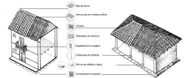 Materiales: muros en bareque , muros en tierra apisonados de gran capacidad térmica, pisos en madera, y acristalamiento.