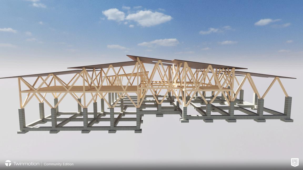 El material constructivo es madera de pino principalmente, la cual se dispone en ambos sentidos para logar mayor rigidez, esta consta de conexiones en las intersecciones de las diagonales y cimentación con placas de acero atornilladas para evitar desgaste de estas.