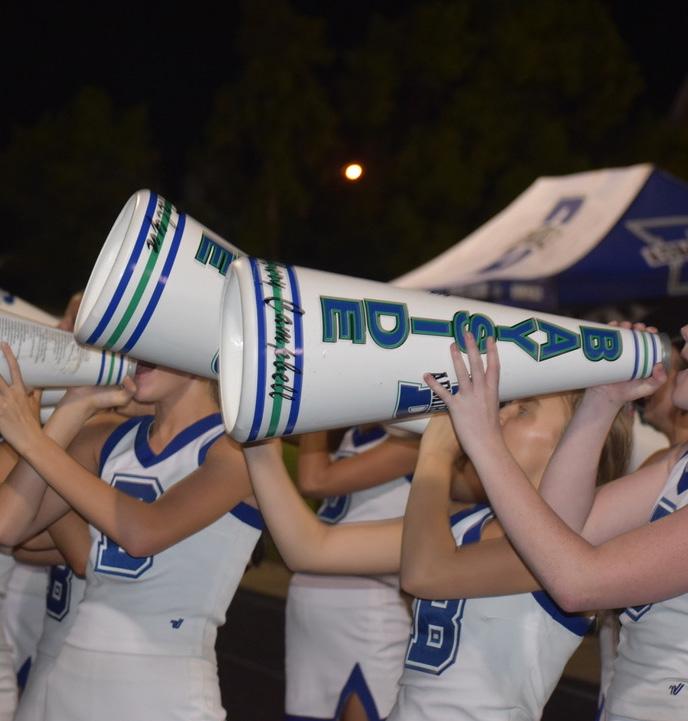 2. Amplifying school spirit, the cheer squad shouts with joy into their megaphones.