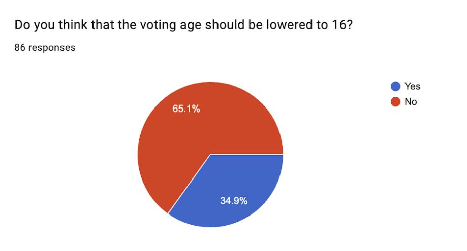 Participants felt that the younger generation was also an integral part of America’s public; therefore, their voices should be heard by the casting of ballots. Bayside students, however, feel di erently. A whopping majority of 65.1% of the 86 Upper School Admirals who voted believe that the voting age should not be lowered, and only 34.9% believe it should.