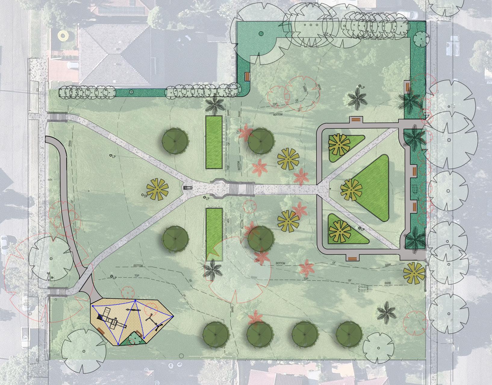 NEW FORMALISED GARDEN BED WITH STONE EDGING AND LOW LEVEL FEATURE PLANTING, IN KEEPING WITH ORIGINAL 1928 PARK LAYOUT
