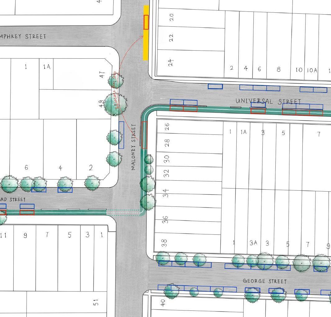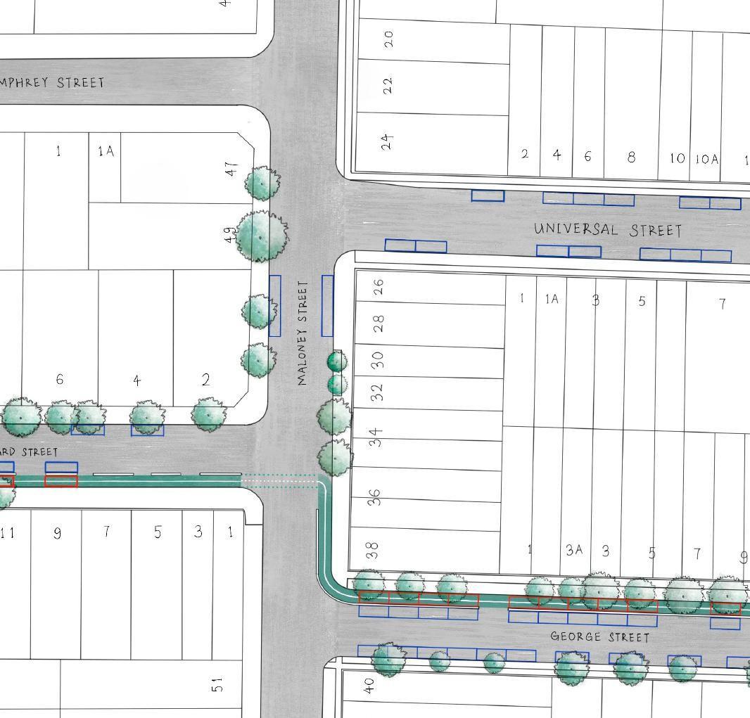 To achieve a separated cycleway along George Street, northern on -street parking must be adjusted. While this results in no quantum change, the east -bound bus stop must be relocated to Universal Street to avoid conflicts between cyclists and bus patrons.