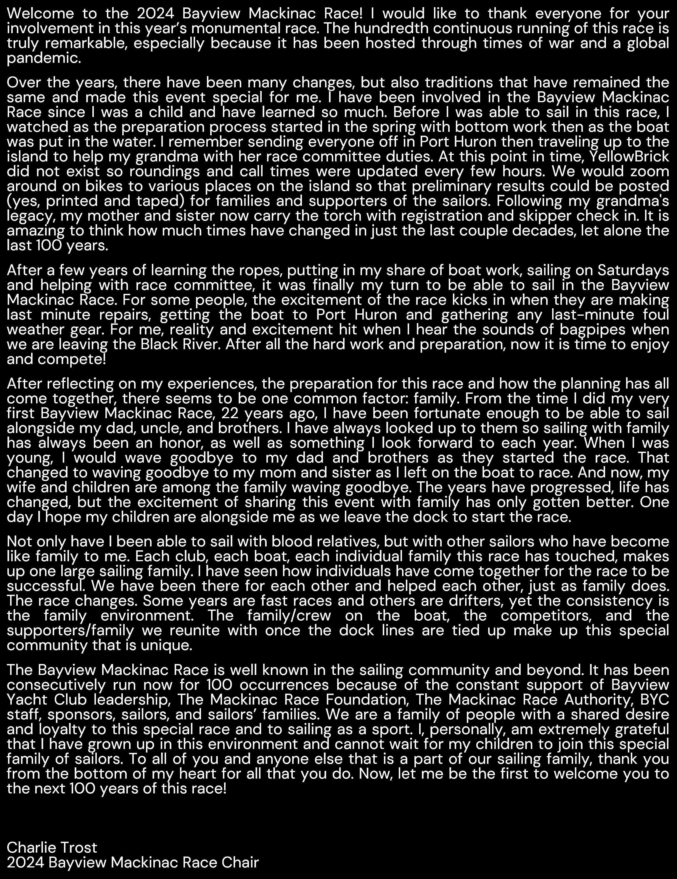 It takes a lot of people to make this race happen I want to take a moment to thank our General Manager, Matt Prost, and all of our Bayview staff, this year’s race chair, Charlie Trost, and the other Mackinac Race Authority members, the Mackinac Race Foundation, along with all of the volunteers, and the United States Coast Guard.