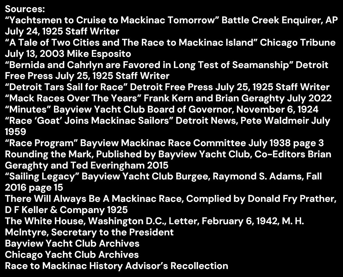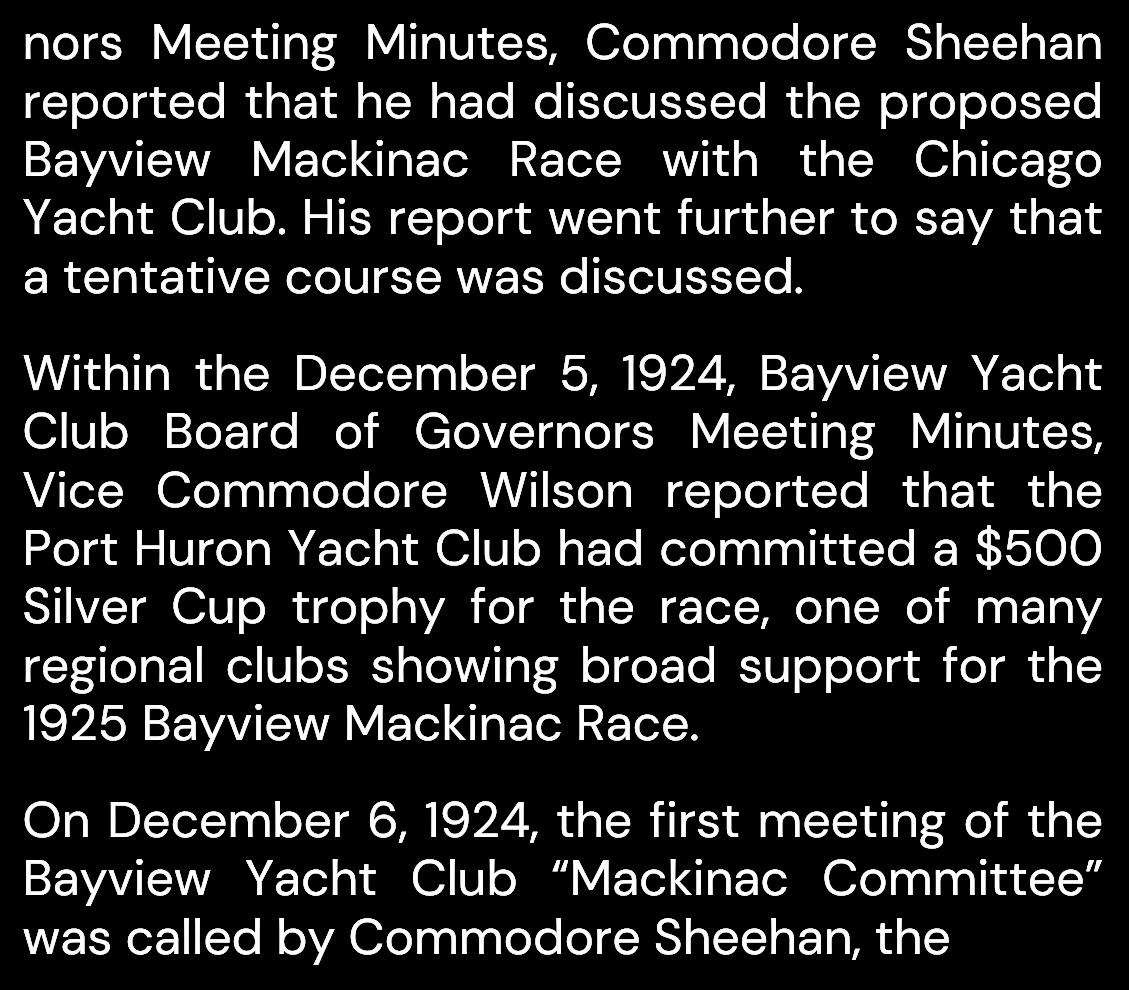 The work to initiate a Mackinac Island race by the Bayview Yacht Club followed the success of a Bayview team in the 1924 Newport Bermuda race, taking first in class on the schooner “Lloyd W. Berry.” Within the November 4, 1924, Bayview Yacht Club Board of Gover-