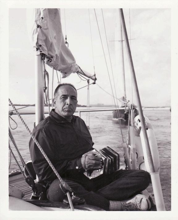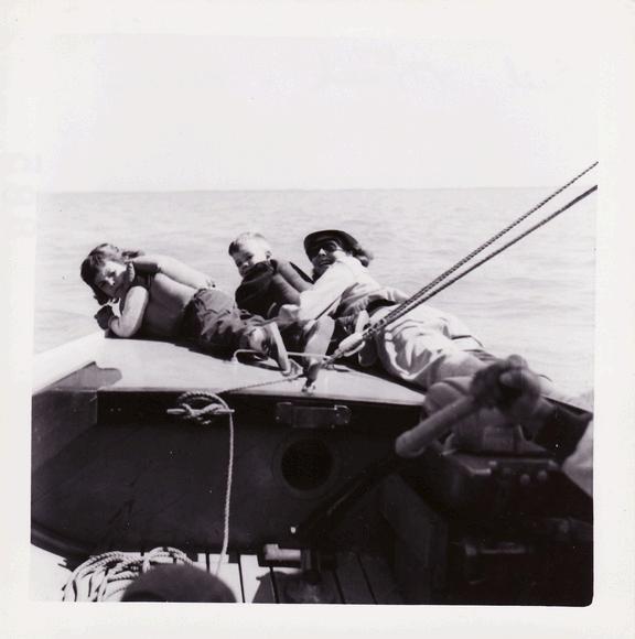 Marc Hollerbach with sister Beth & mother, Elizabeth on the aft deck ofCapella, his father’s 27' Triangle sloop (1953) Chivaree, my father’s 35' yawl, my first Mackinac race (1964) and my first Mackinac win (1968) Old Goat “Holly” Hollerbach motoring up the St. Clair River for the start of the Bayview Mackinac Race on Chjvaree (1964)