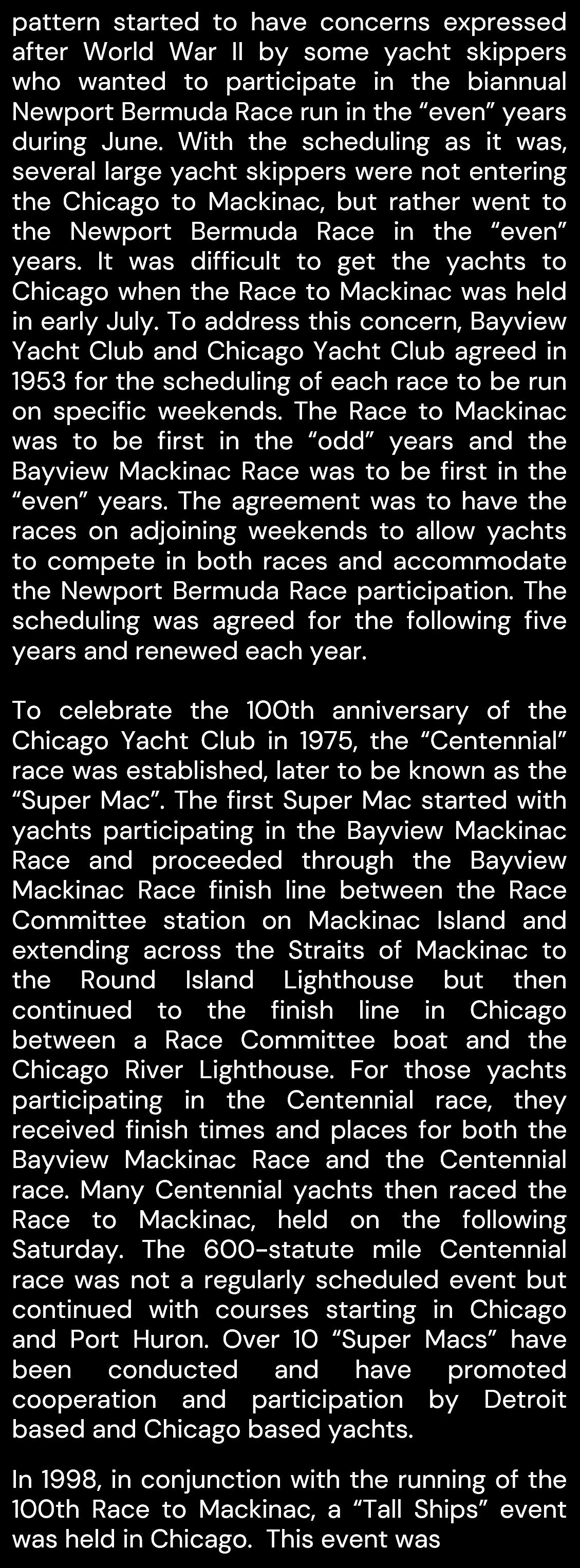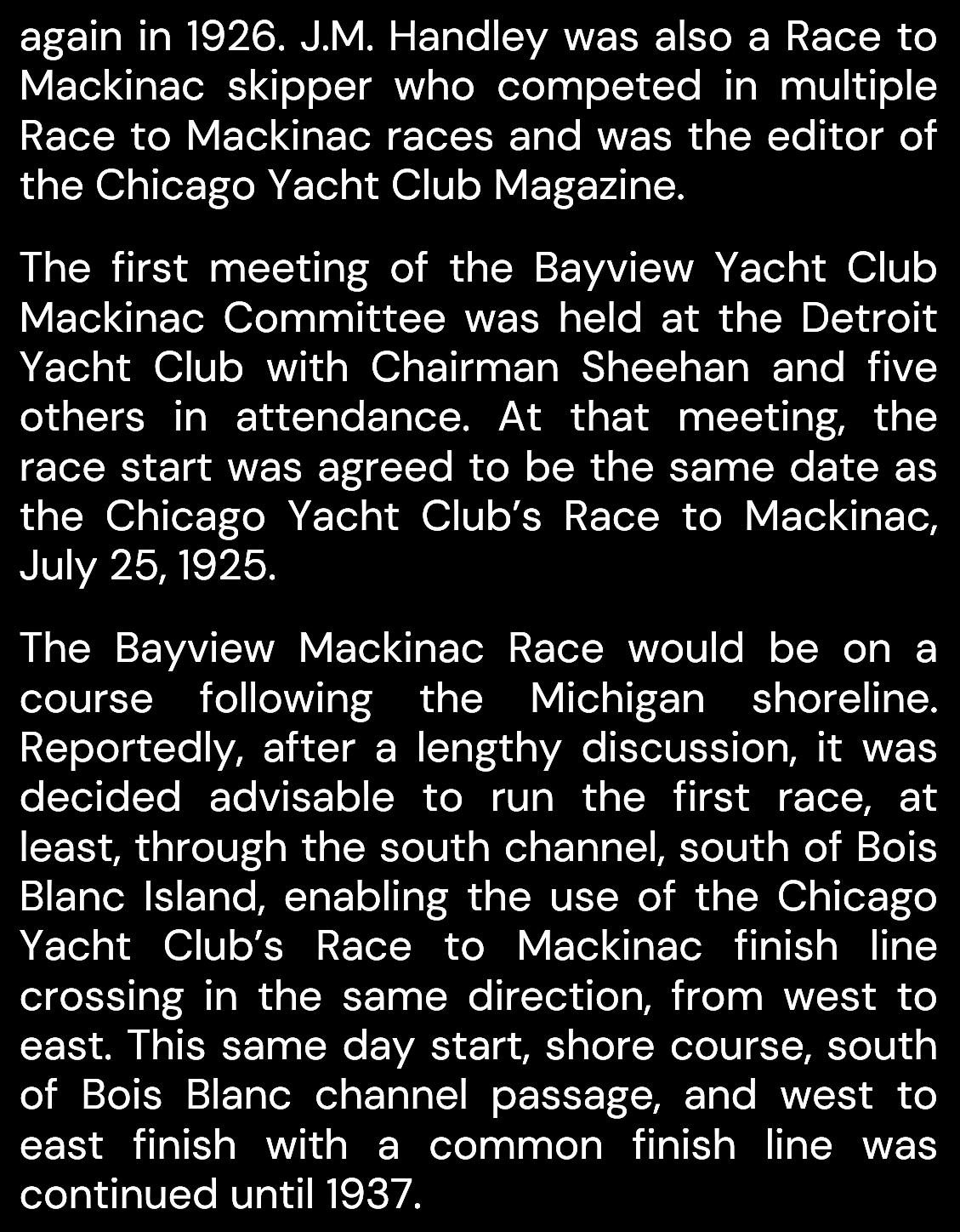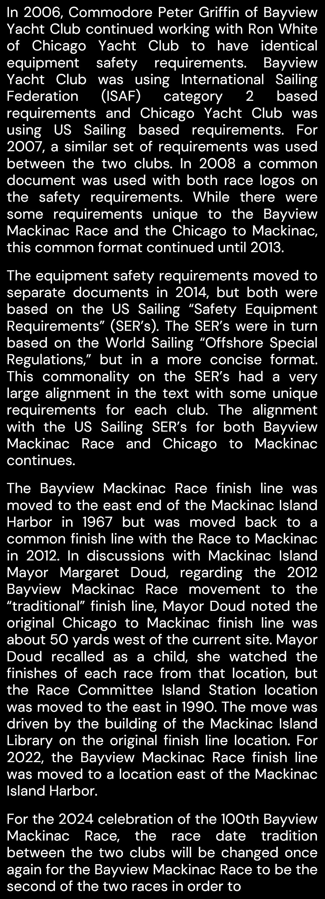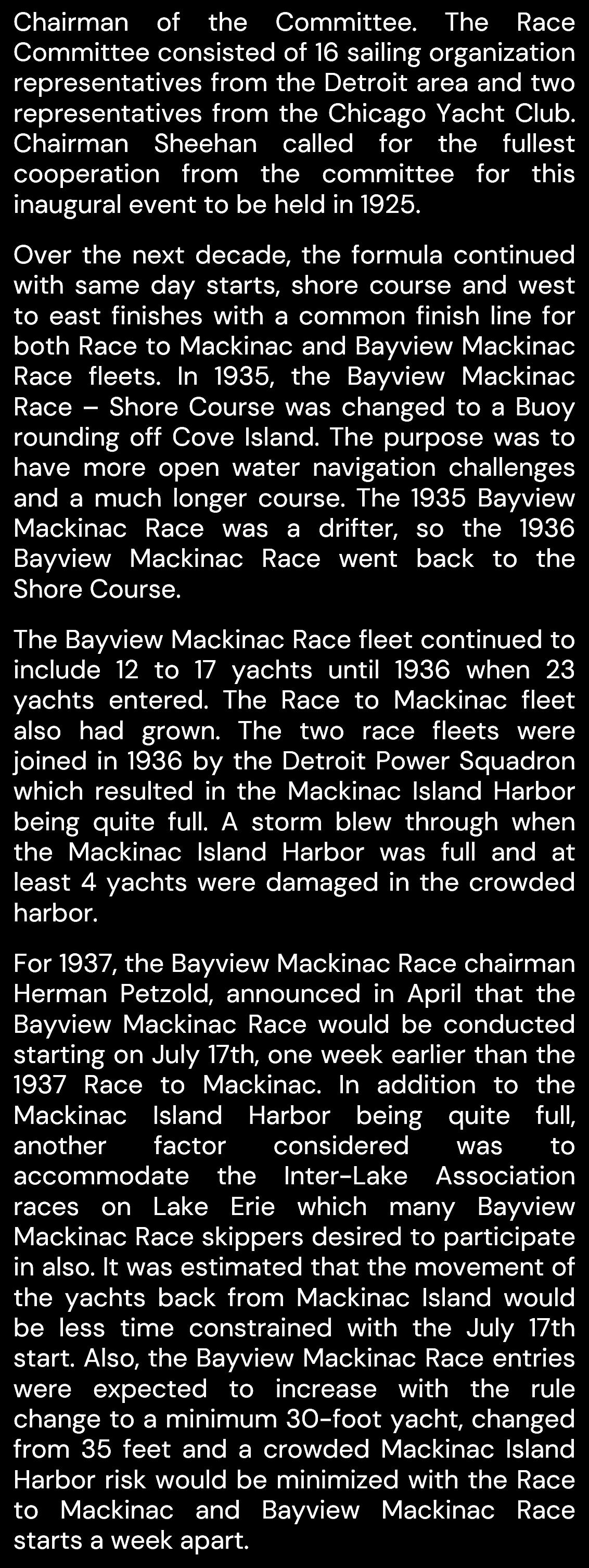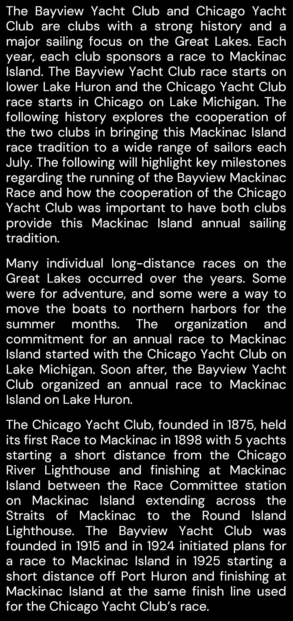 Since its inaugural race in 1925, the Bayview Mackinac Race has become one of the most prestigious and anticipated events in the sailing world As we gather to celebrate this milestone, we pay tribute to the countless sailors, supporters, and enthusiasts who have made this race an enduring tradition