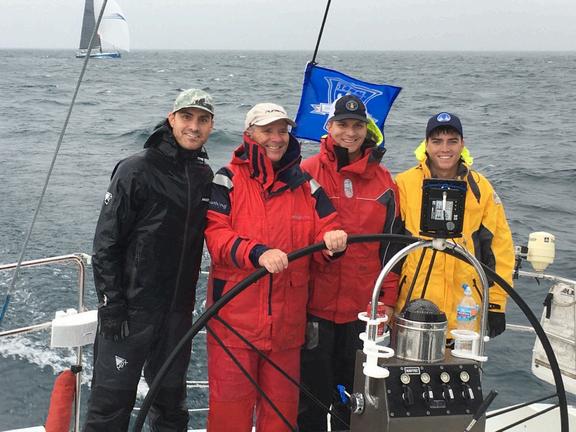 Marc Hollerbach sailing the 2019 Bayview Mackinac Race with his sons Nathan, Adam, & Ian on Dynamis.