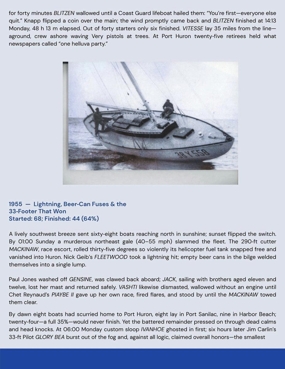 Race veterans know that years ending in “5” have produced some of the lake’s fiercest weather—1925’s six-fleet, 1955’s lightning-lit knockdowns, and 1985’s sinking of Tomahawk. Their lesson endures: reef early, respect Huron, and help your neighbor.