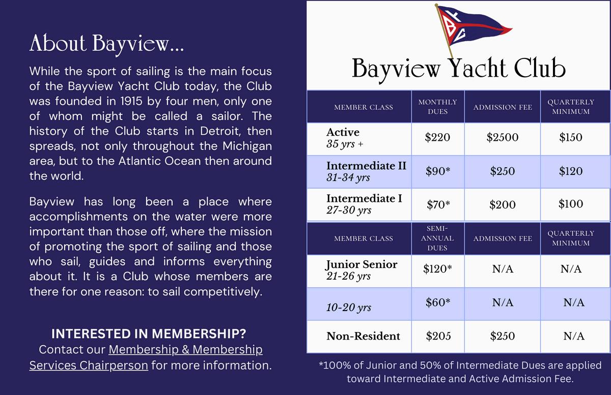 Welcome to Bayview Yacht Club, one of the most storied and historic sailing clubs in the nation As we look forward to our 101st Anniversary of the Mackinac Race in 2025 we are reminded of our long history as a sailing club and the members that have brought us to this point. Bayview continues to develop many of the nation’s top sailors and has members competing in regattas around the world.